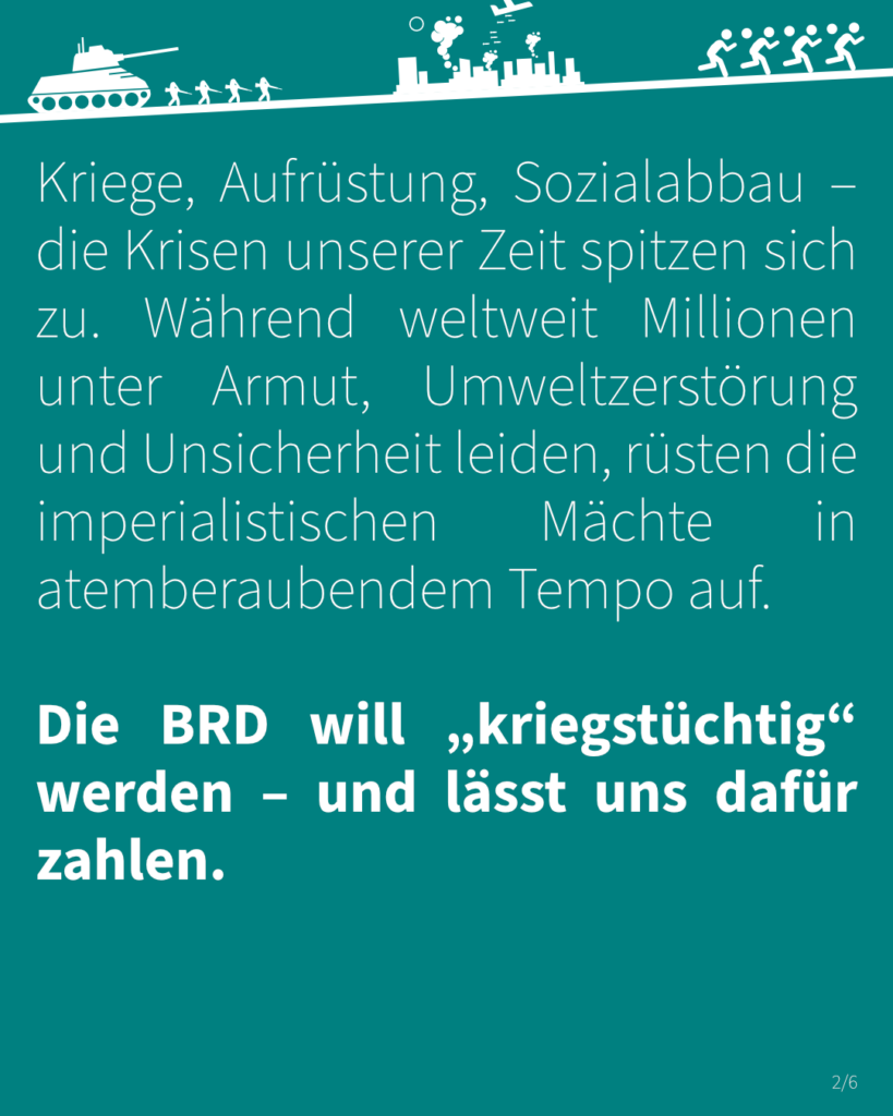 Kriege, Aufrüstung, Sozialabbau – die Krisen unserer Zeit spitzen sich zu. Während weltweit Millionen unter Armut, Umweltzerstörung und Unsicherheit leiden, rüsten die imperialistischen Mächte in atemberaubendem Tempo auf. Die BRD will „kriegstüchtig“ werden – und lässt uns dafür zahlen.