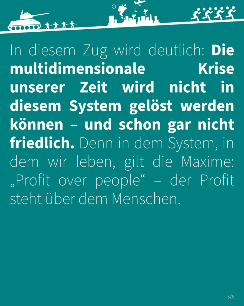 In diesem Zug wird deutlich: Die multidimensionale Krise unserer Zeit wird nicht in diesem System gelöst werden können – und schon gar nicht friedlich. Denn in dem System, in dem wir leben, gilt die Maxime: „Profit over people“ – der Profit steht über dem Menschen.