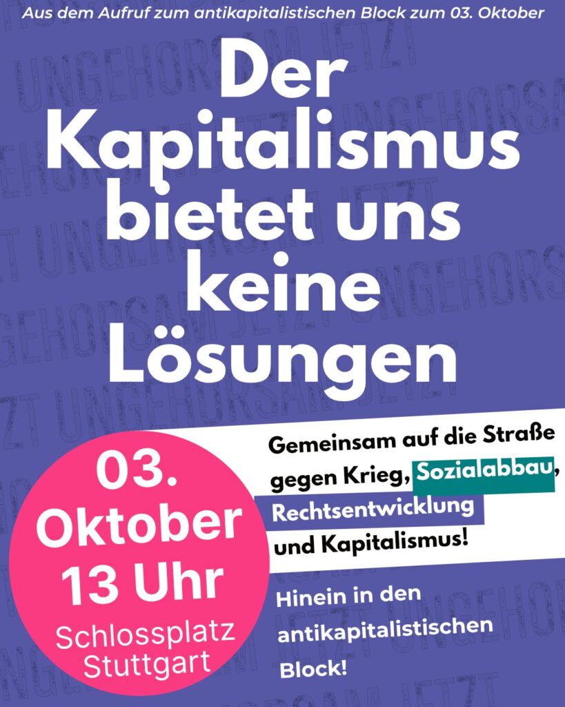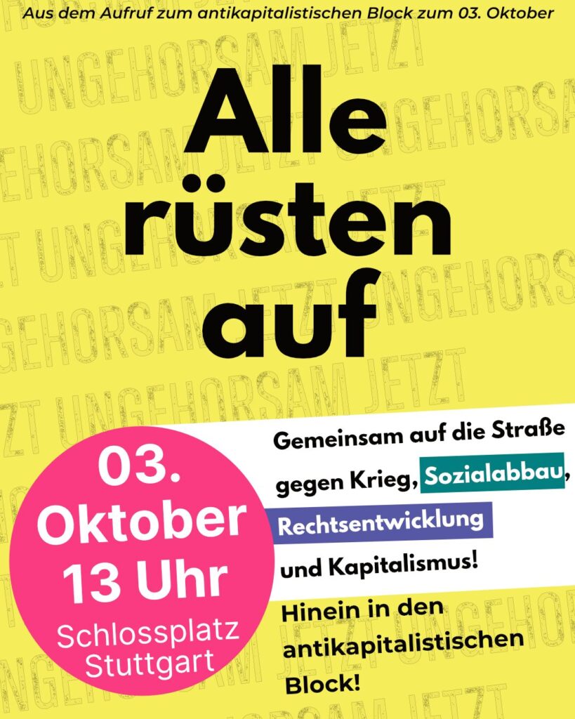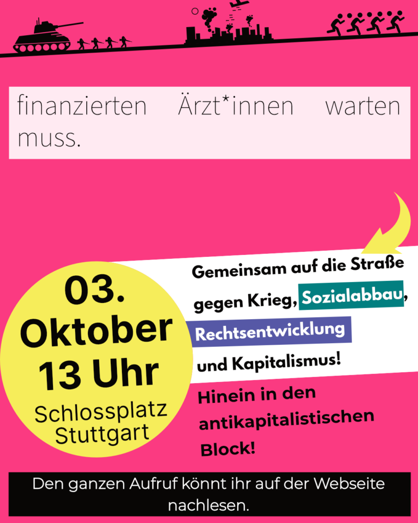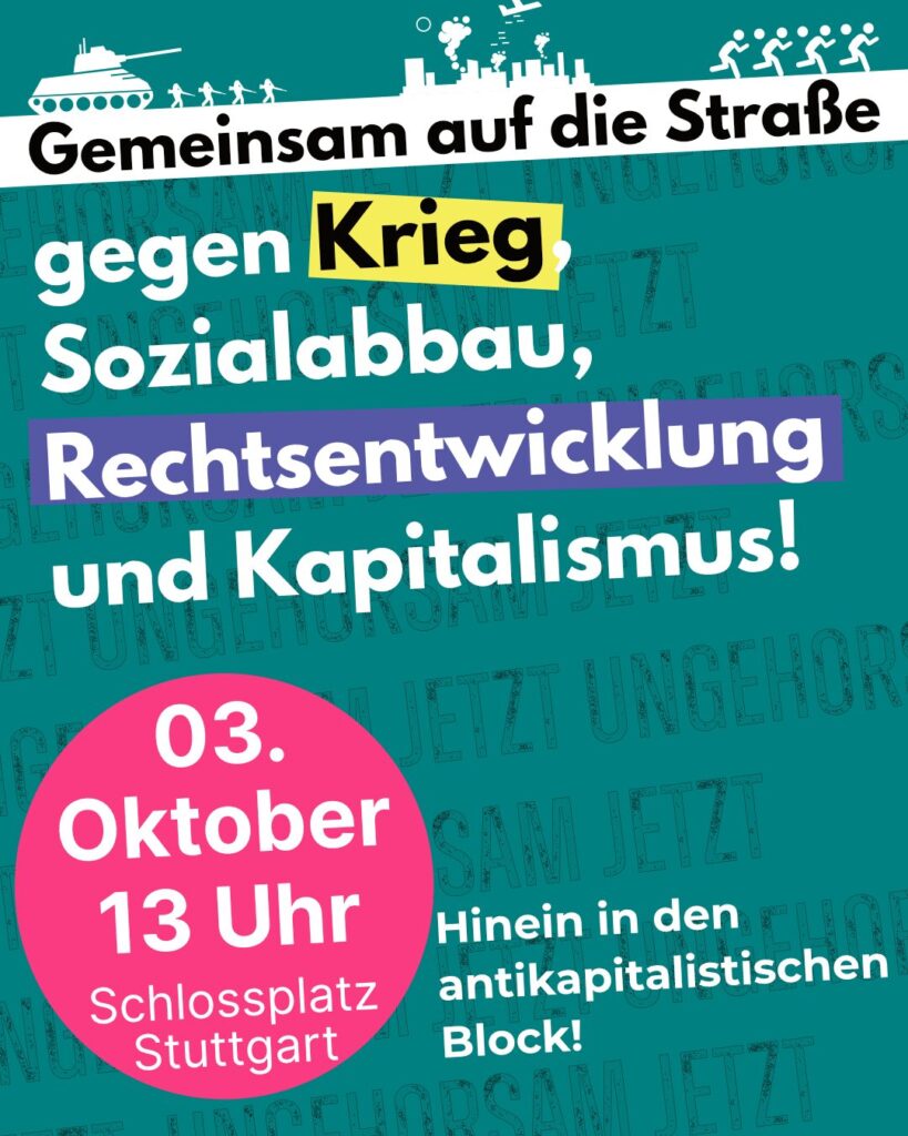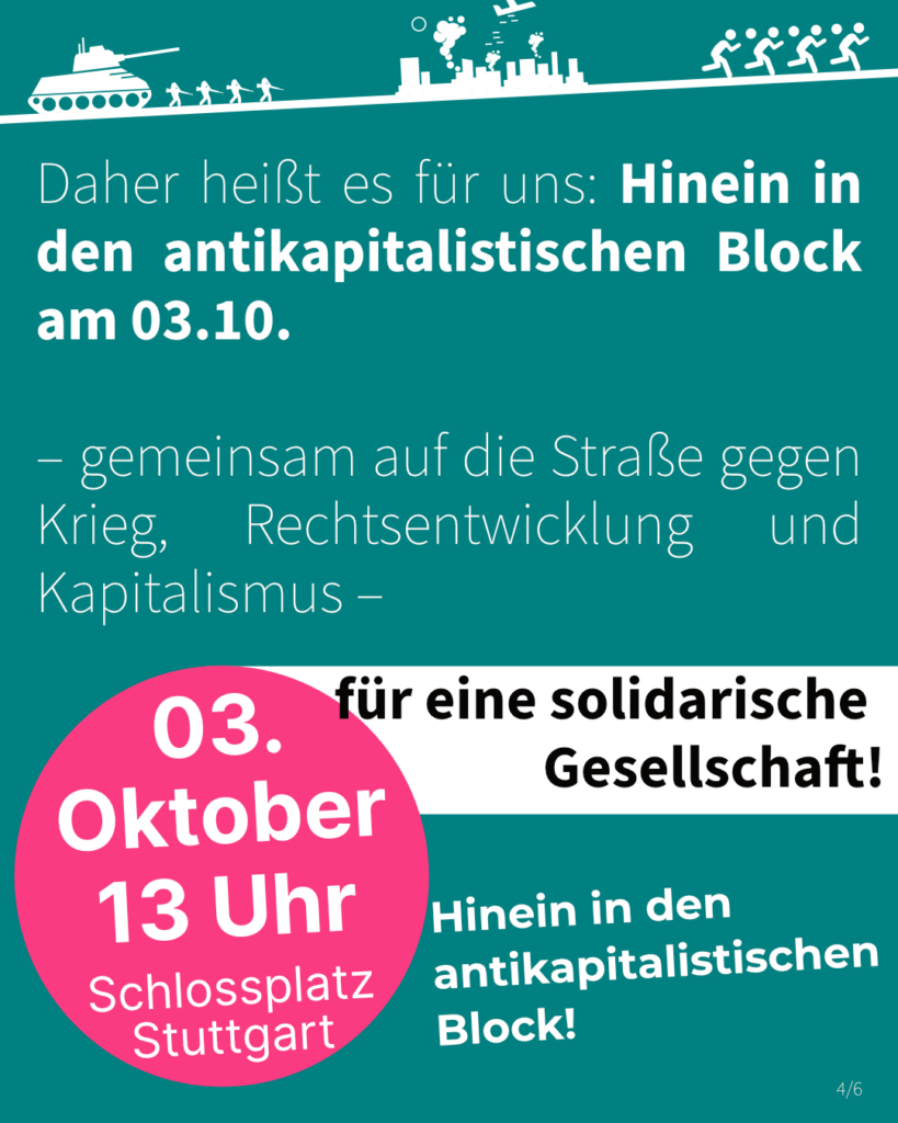 Daher heißt es für uns: Hinein in den antikapitalistischen Block am 03.10. – gemeinsam auf die Straße gegen Krieg, Rechtsentwicklung und Kapitalismus – für eine solidarische Gesellschaft!