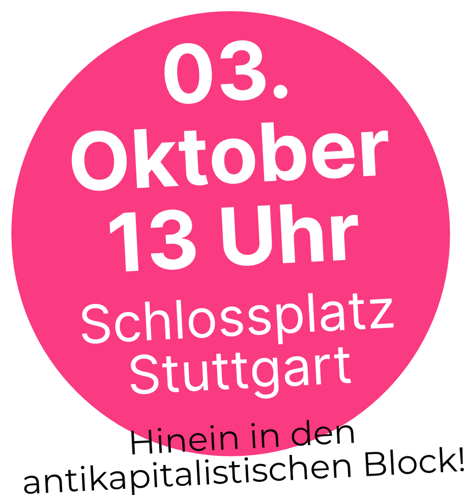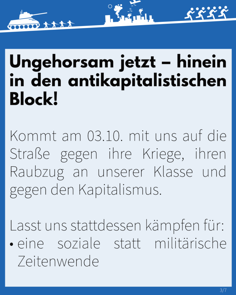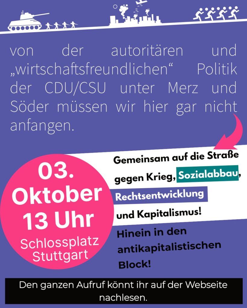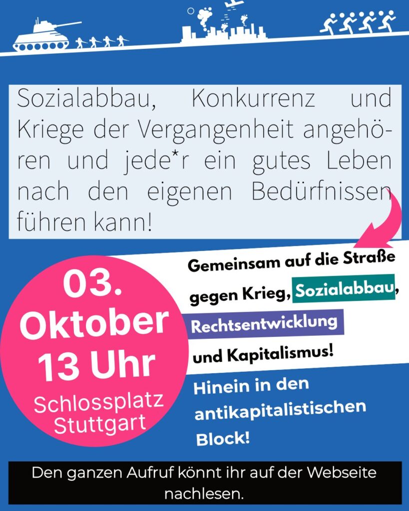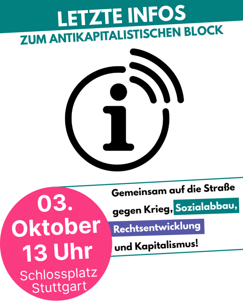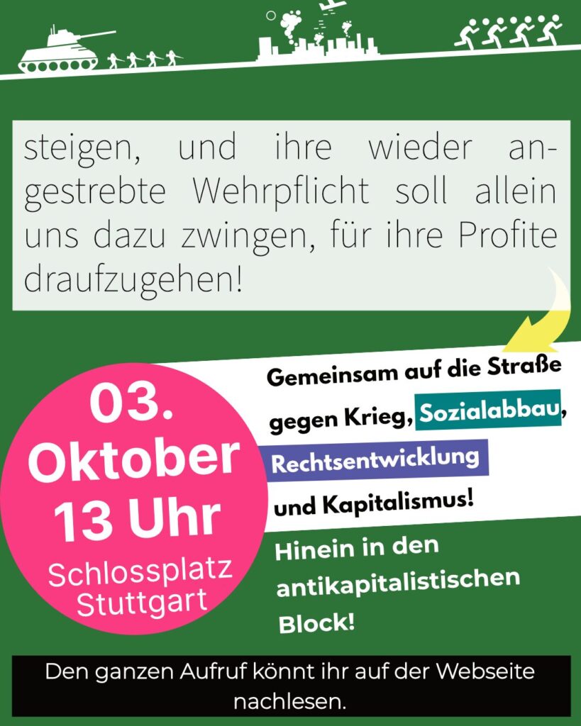 Daher heißt es für uns: Hinein in den antikapitalistischen Block am 03.10. – gemeinsam auf die Straße gegen Krieg, Rechtsentwicklung und Kapitalismus – für eine solidarische Gesellschaft!