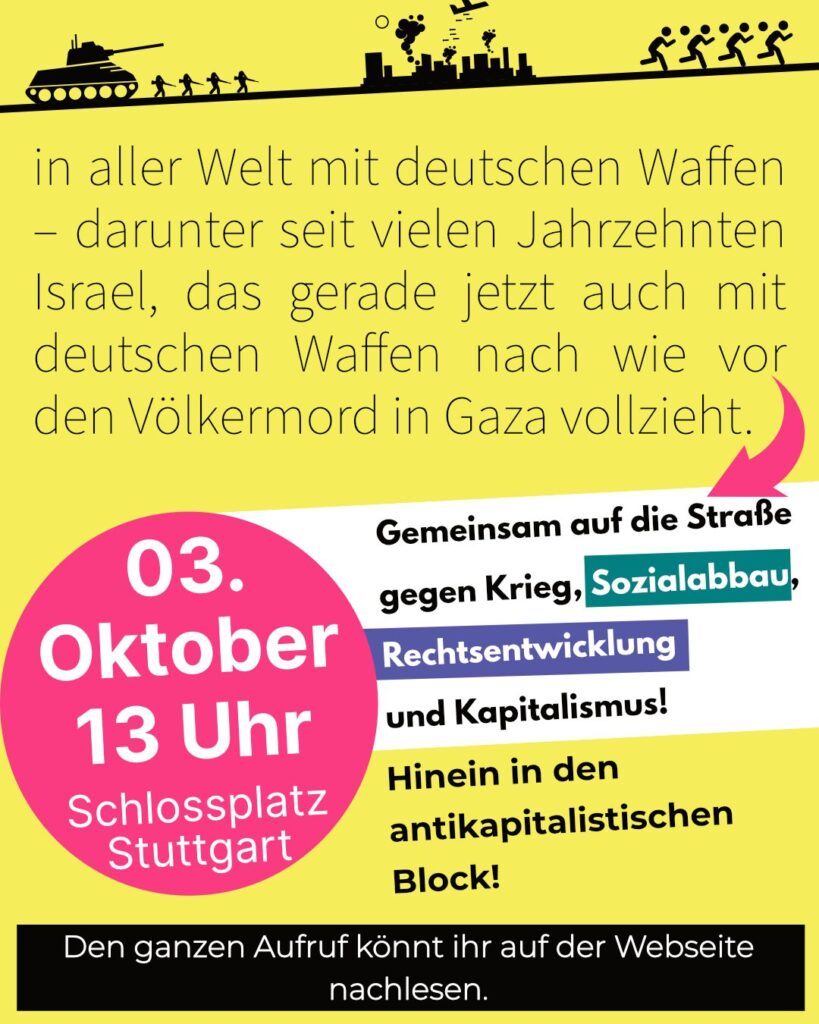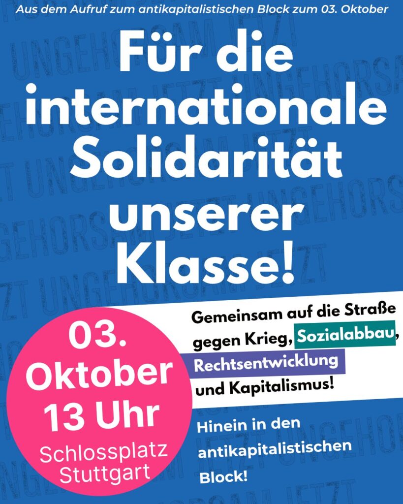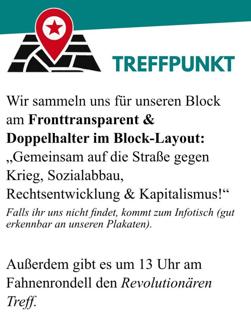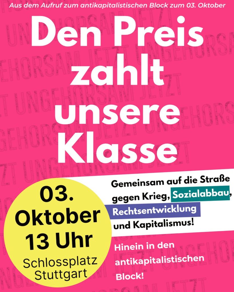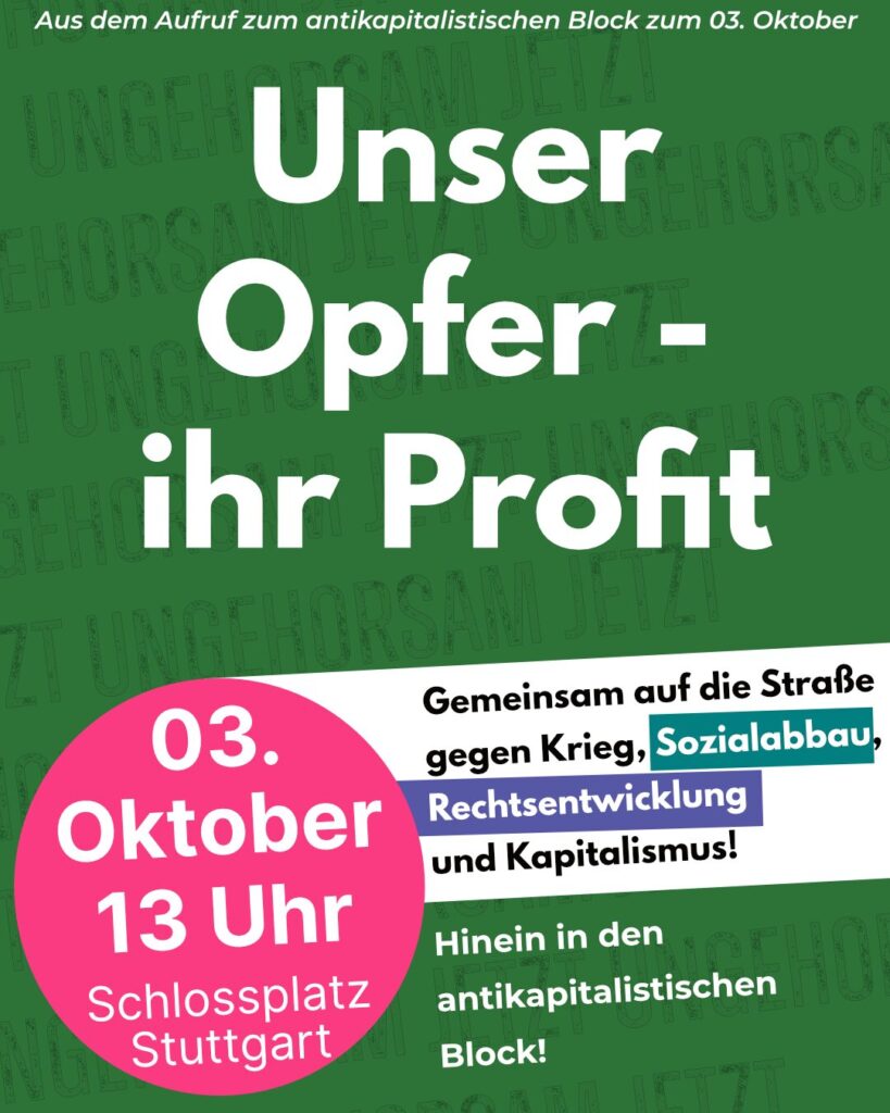 Daher heißt es für uns: Hinein in den antikapitalistischen Block am 03.10. – gemeinsam auf die Straße gegen Krieg, Rechtsentwicklung und Kapitalismus – für eine solidarische Gesellschaft!