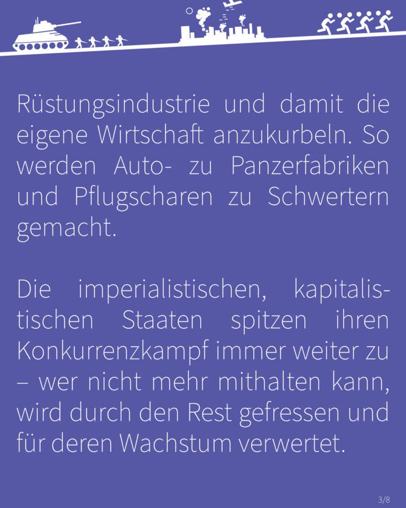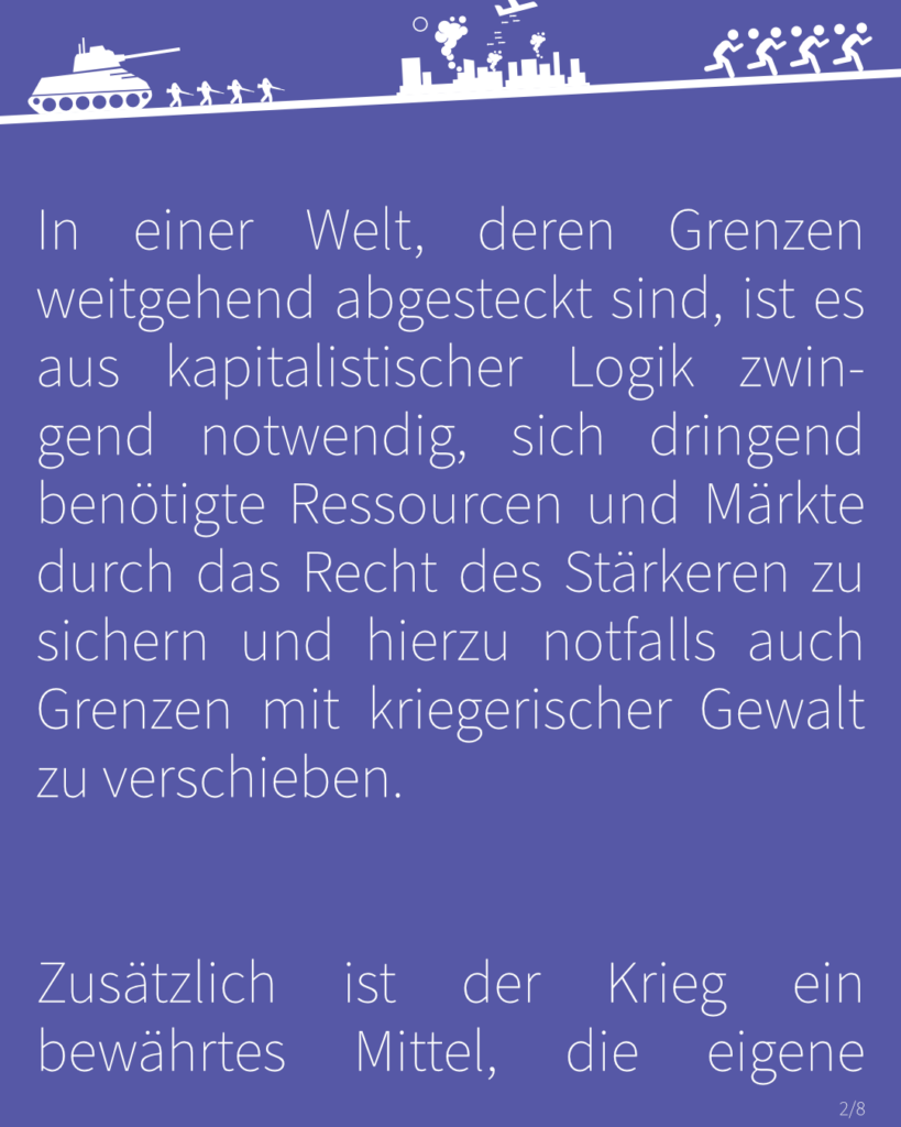 Denn in einer Welt, deren Grenzen weitgehend abgesteckt sind, ist es aus kapitalistischer Logik eben zwingend notwendig, sich dringend benötigte Ressourcen und Märkte durch das Recht des Stärkeren zu sichern und hierzu notfalls auch Grenzen mit kriegerischer Gewalt zu verschieben. Zusätzlich ist der Krieg ein bewährtes Mittel, die eigene Rüstungsindustrie und damit die eigene Wirtschaft anzukurbeln. So werden Auto- zu Panzerfabriken und Pflugscharen zu Schwertern gemacht.