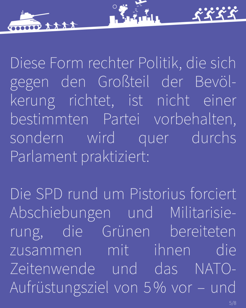 Die SPD rund um Pistorius forciert Abschiebungen und Militarisierung, die Grünen bereiteten zusammen mit ihnen die Zeitenwende und das NATO-Aufrüstungsziel von 5 % vor – und von der autoritären und „wirtschaftsfreundlichen“ Politik der CDU/CSU unter Merz und Söder müssen wir hier gar nicht anfangen.