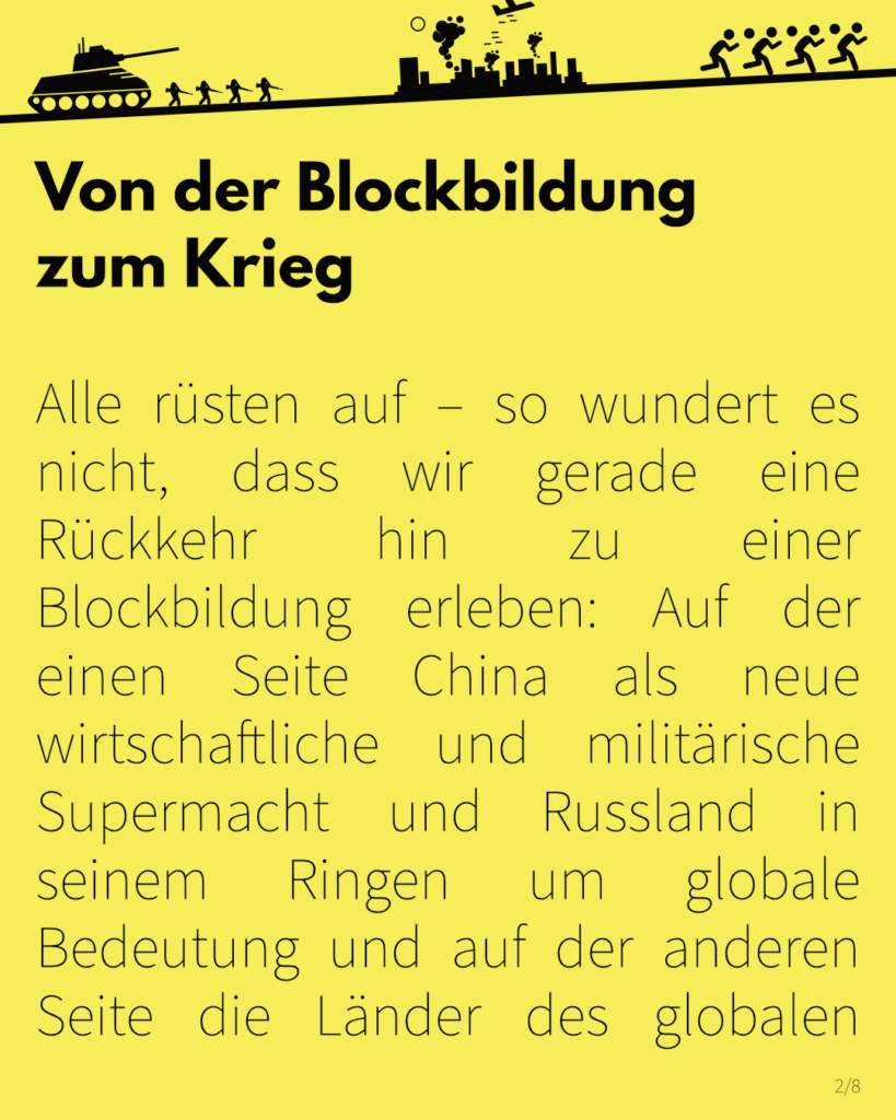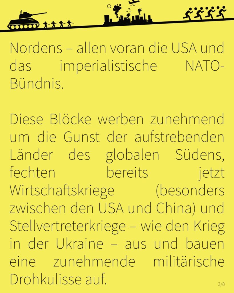 Alle rüsten auf – so wundert es nicht, dass wir gerade eine Rückkehr hin zu einer Blockbildung erleben: Auf der einen Seite China als neue wirtschaftliche und militärische Supermacht und Russland in seinem Ringen um globale Bedeutung und auf der anderen Seite die Länder des globalen Nordens – allen voran die USA und das imperialistische NATO-Bündnis. Diese Blöcke werben zunehmend um die Gunst der aufstrebenden Länder des globalen Südens, fechten bereits jetzt Wirtschaftskriege (besonders zwischen den USA und China) und Stellvertreterkriege – wie den Krieg in der Ukraine – aus und bauen eine zunehmende militärische Drohkulisse auf. Besonders durch die immer schneller rotierende Aufrüstungsspirale von NATO und den EU-Staaten steigt das Risiko eines 3. Weltkriegs in ganz neue Höhen.