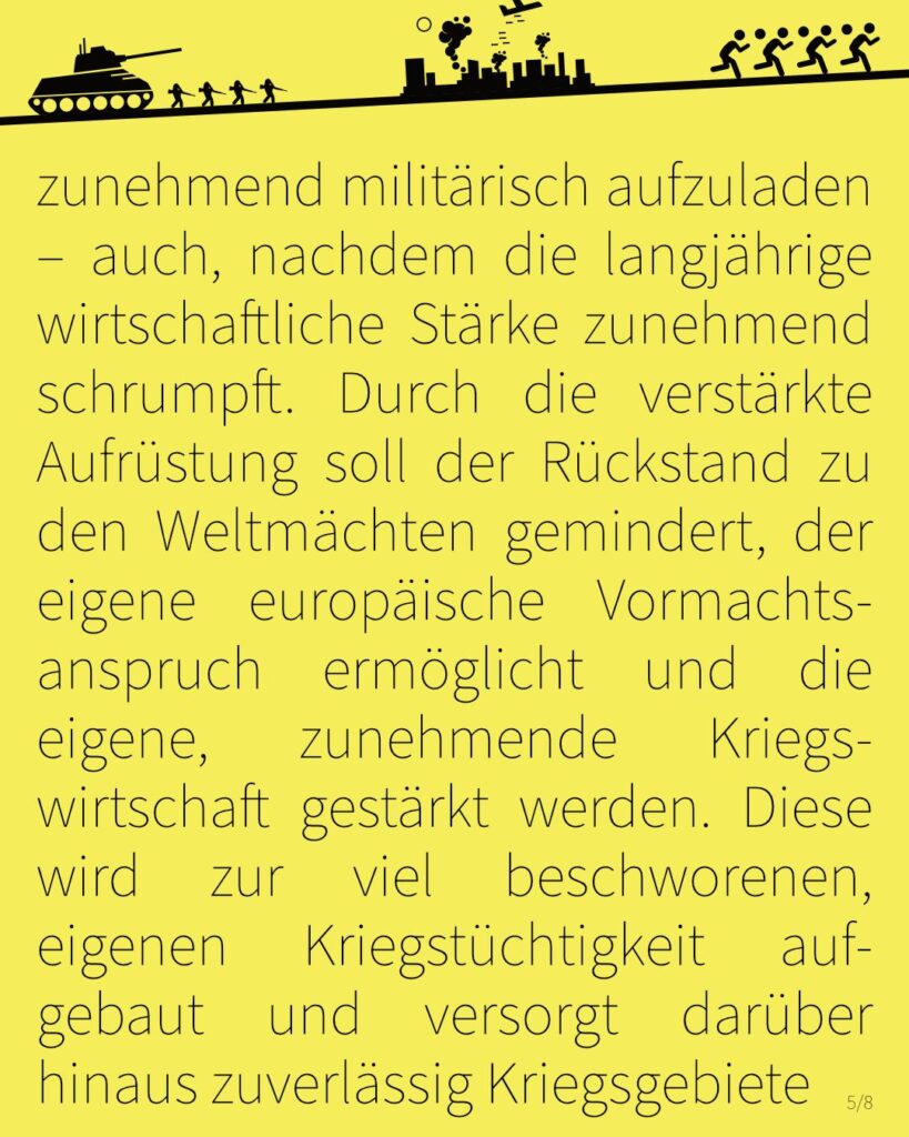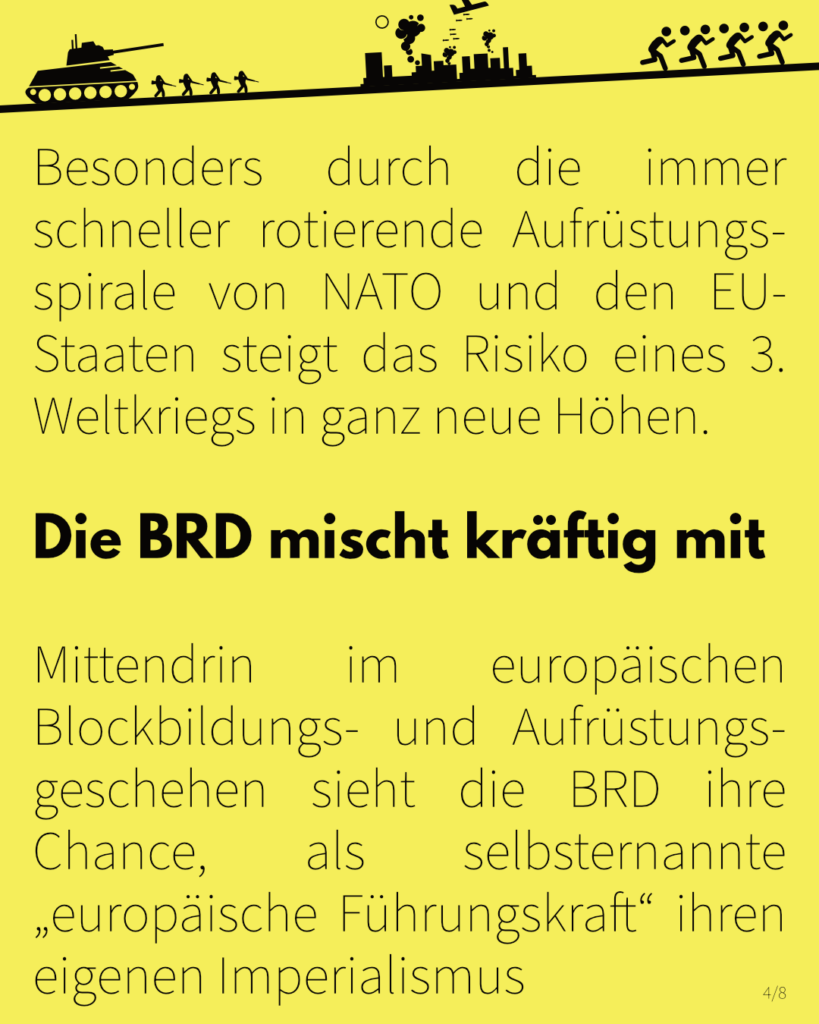 Mittendrin im europäischen Blockbildungs- und Aufrüstungsgeschehen sieht die BRD ihre Chance, als selbsternannte „europäische Führungskraft“ ihren eigenen Imperialismus zunehmend militärisch aufzuladen – auch, nachdem die langjährige wirtschaftliche Stärke zunehmend schrumpft. Durch die verstärkte Aufrüstung soll der Rückstand zu den Weltmächten gemindert, der eigene europäische Vormachtsanspruch ermöglicht und die eigene, zunehmende Kriegswirtschaft gestärkt werden. Diese wird zur viel beschworenen, eigenen Kriegstüchtigkeit aufgebaut und versorgt darüber hinaus zuverlässig Kriegsgebiete in aller Welt mit deutschen Waffen – darunter seit vielen Jahrzehnten Israel, das gerade jetzt auch mit deutschen Waffen nach wie vor den Völkermord in Gaza vollzieht.