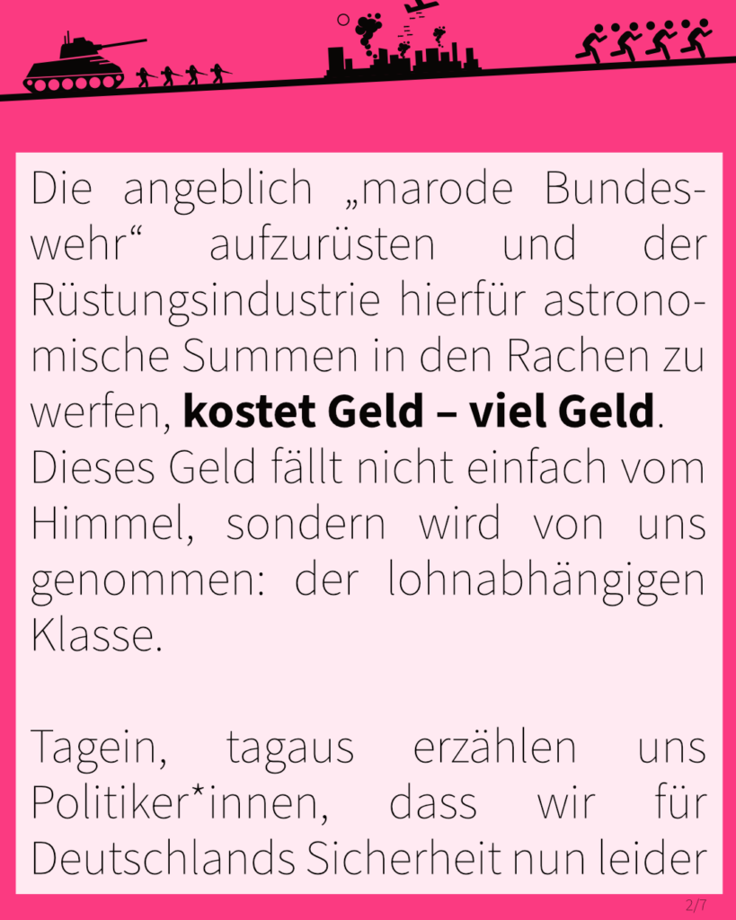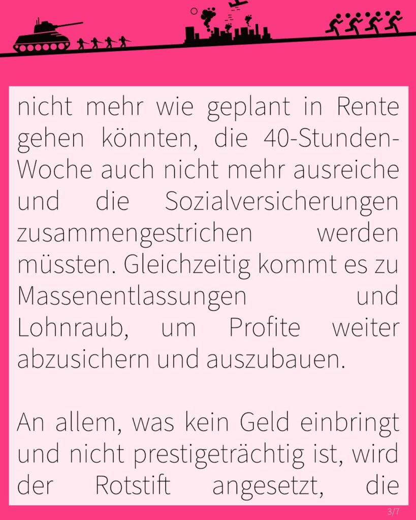 Tagein, tagaus erzählen uns Politiker*innen, dass wir für Deutschlands Sicherheit nun leider nicht mehr wie geplant in Rente gehen könnten, die 40-Stunden-Woche auch nicht mehr ausreiche und die Sozialversicherungen zusammengestrichen werden müssten. Gleichzeitig kommt es zu Massenentlassungen und Lohnraub, um Profite weiter abzusichern und auszubauen.