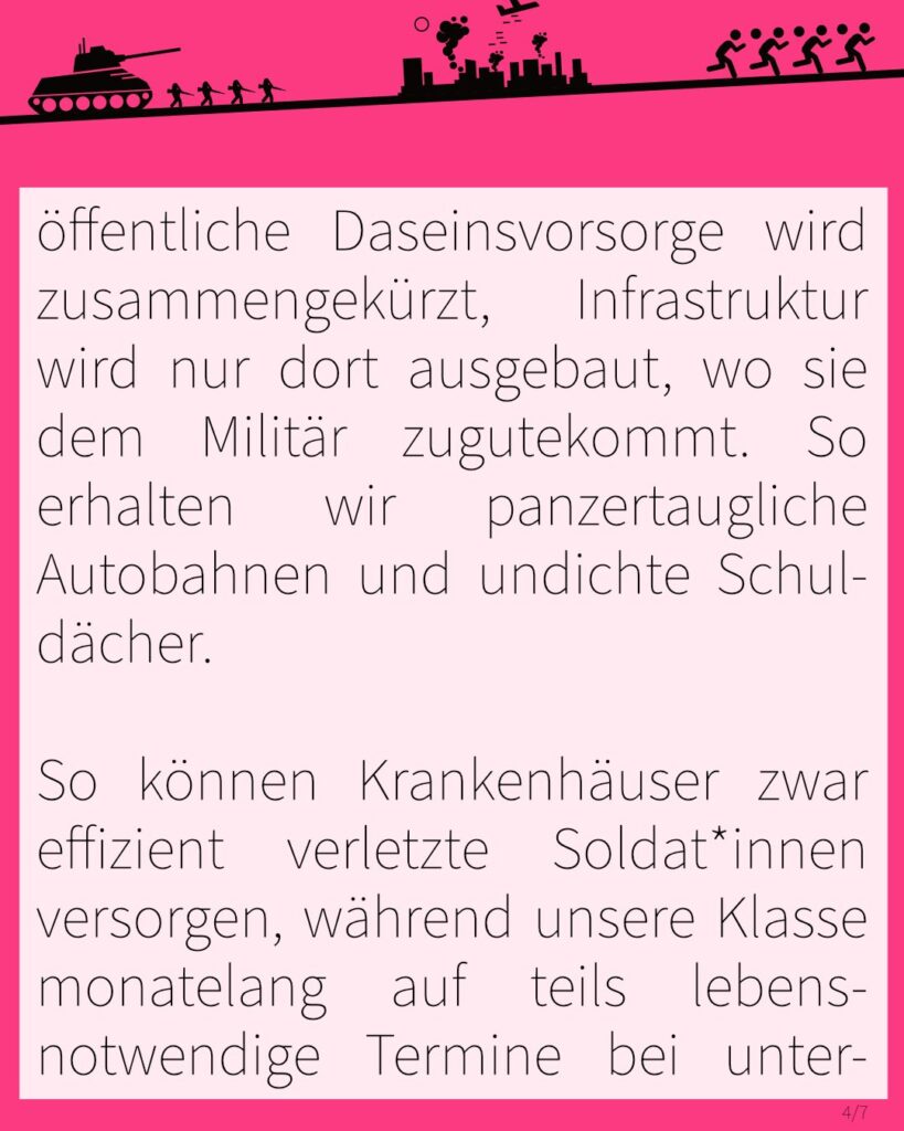 An allem, was kein Geld einbringt und nicht prestigeträchtig ist, wird der Rotstift angesetzt, die öffentliche Daseinsvorsorge wird zusammengekürzt, Infrastruktur wird nur dort ausgebaut, wo sie dem Militär zugutekommt. So erhalten wir panzertaugliche Autobahnen und undichte Schuldächer. So können Krankenhäuser zwar effizient verletzte Soldat*innen versorgen, während unsere Klasse monatelang auf teils lebensnotwendige Termine bei unterfinanzierten Ärzt*innen warten muss.