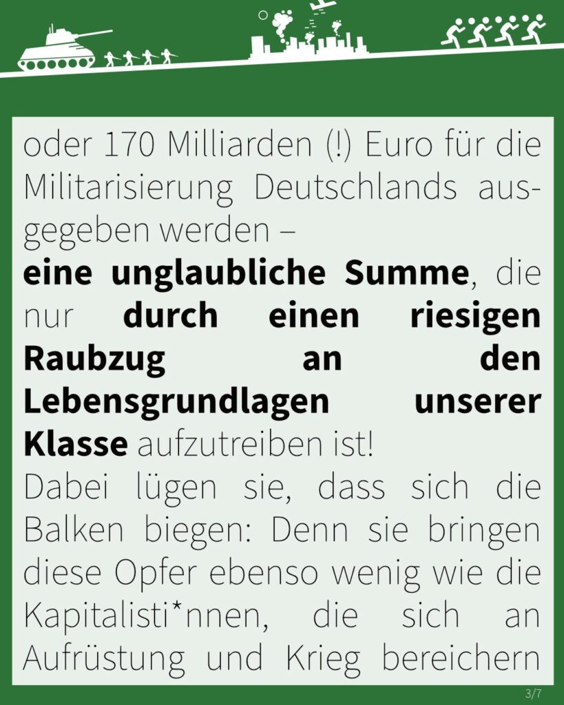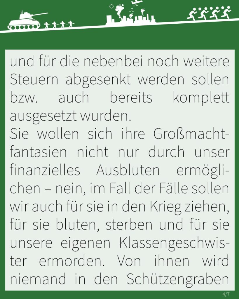 Sie wollen sich ihre Großmachtfantasien nicht nur durch unser finanzielles Ausbluten ermöglichen – nein, im Fall der Fälle sollen wir auch für sie in den Krieg ziehen, für sie bluten, sterben und für sie unsere eigenen Klassengeschwister ermorden. Von ihnen wird niemand in den Schützengraben steigen, und ihre wieder angestrebte Wehrpflicht soll allein uns dazu zwingen, für ihre Profite draufzugehen!