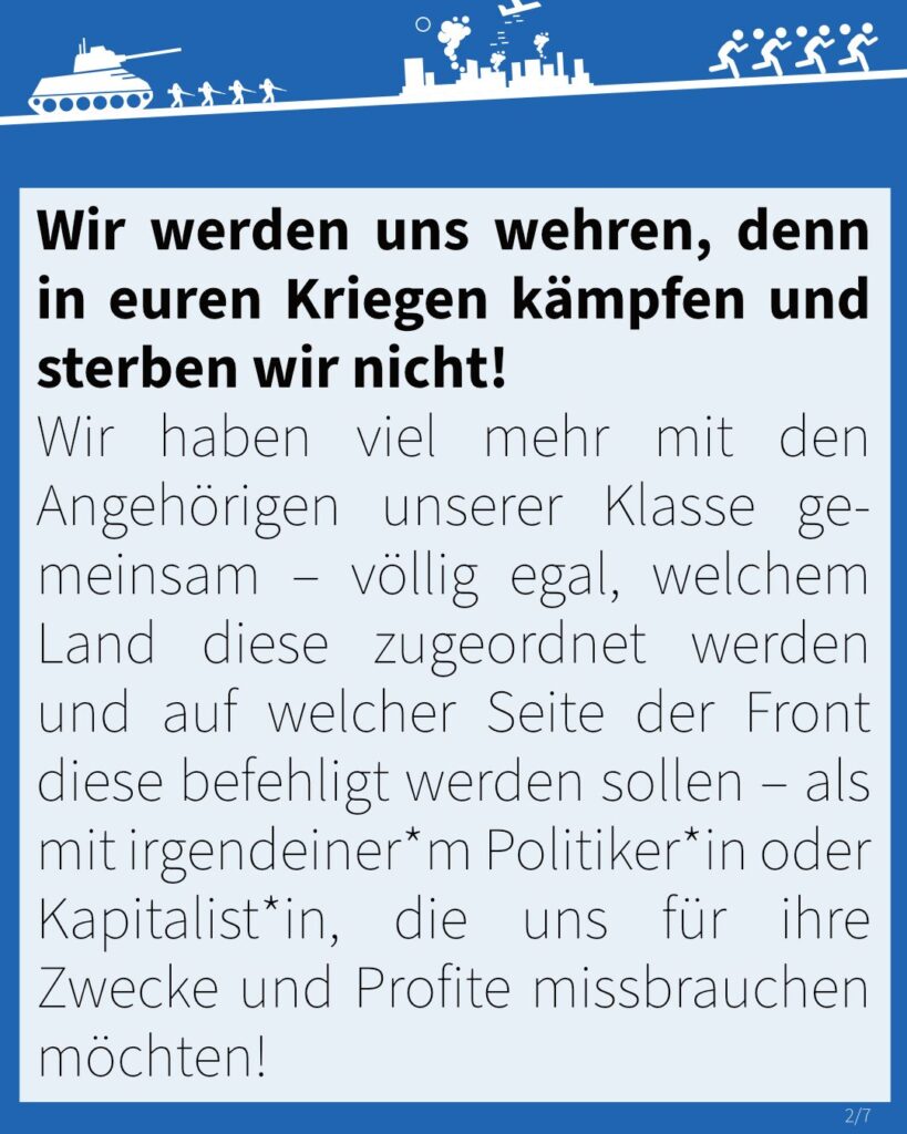 Wir haben viel mehr mit den Angehörigen unserer Klasse gemeinsam – völlig egal, welchem Land diese zugeordnet werden und auf welcher Seite der Front diese befehligt werden sollen – als mit irgendeinerm Politikerin oder Kapitalist*in, die uns für ihre Zwecke und Profite missbrauchen möchten!