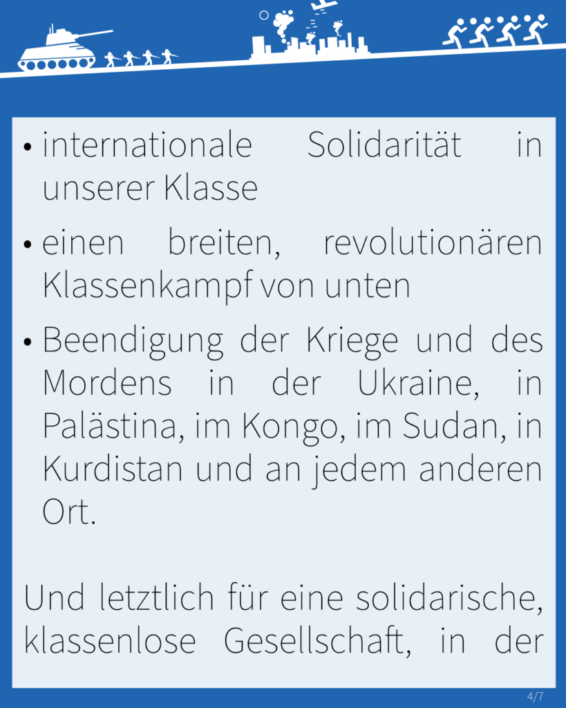 Und letztlich für eine solidarische, klassenlose Gesellschaft, in der Sozialabbau, Konkurrenz und Kriege der Vergangenheit angehören und jede*r ein gutes Leben nach den eigenen Bedürfnissen führen kann!