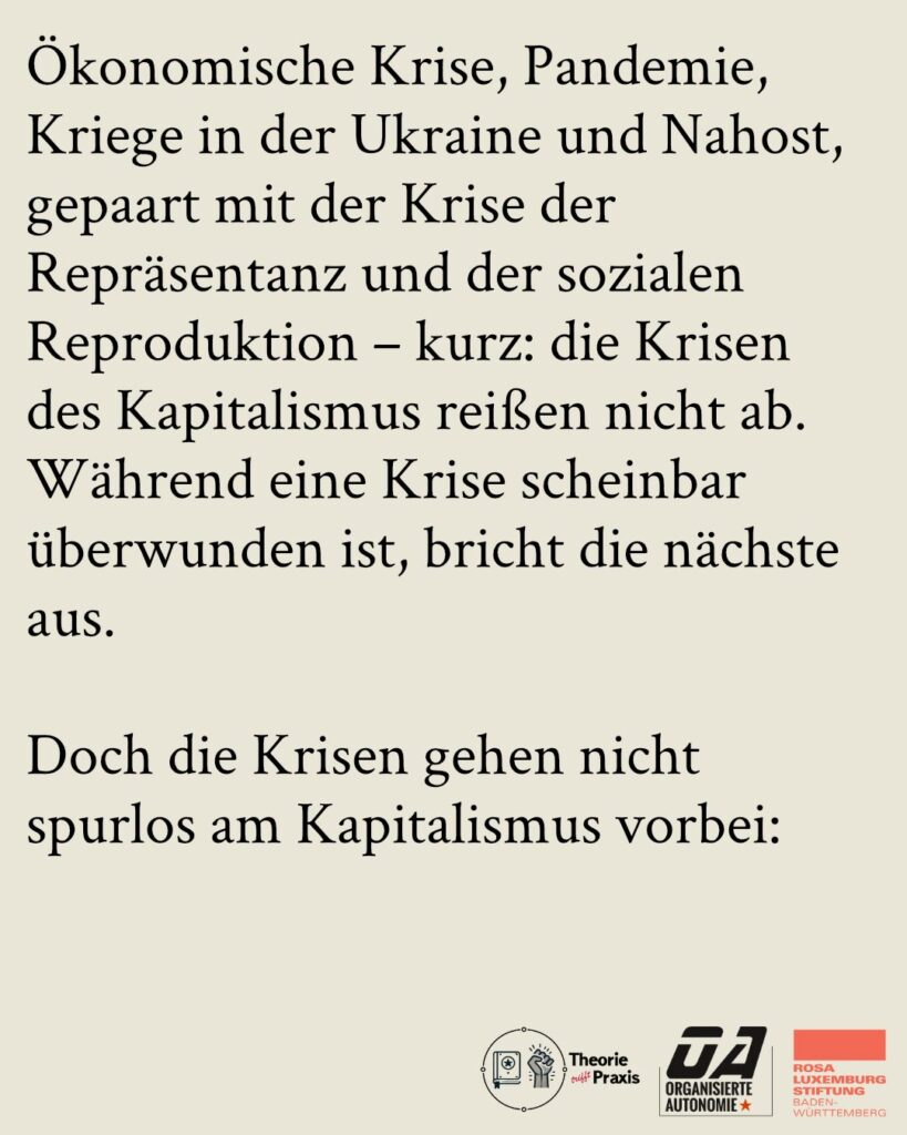 Ökonomische Krise, Pandemie, Kriege in der Ukraine und Nahost, gepaart mit der Krise der Repräsentanz und der sozialen Reproduktion – kurz: die Krisen des Kapitalismus reißen nicht ab. Während eine Krise scheinbar überwunden ist, bricht die nächste aus.