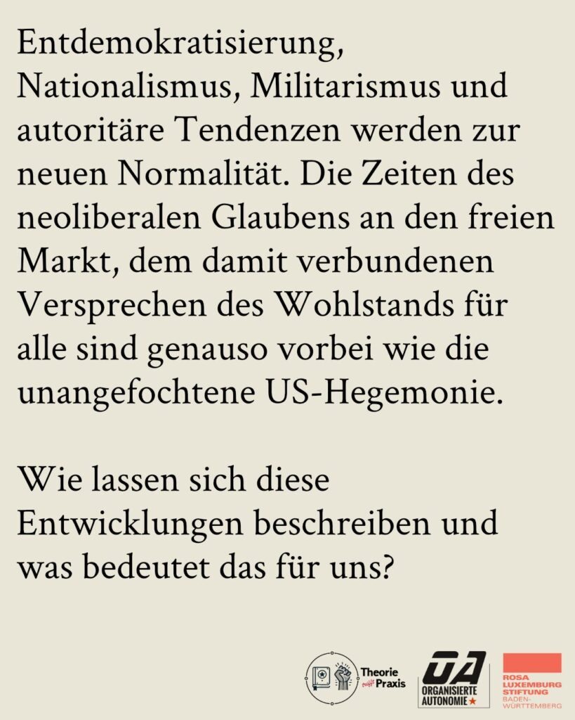 Doch die Krisen gehen nicht spurlos am Kapitalismus vorbei: Entdemokratisierung, Nationalismus, Militarismus und autoritäre Tendenzen werden zur neuen Normalität. Die Zeiten des neoliberalen Glaubens an den freien Markt, dem damit verbundenen Versprechen des Wohlstands für alle sind genauso vorbei wie die unangefochtene US-Hegemonie.