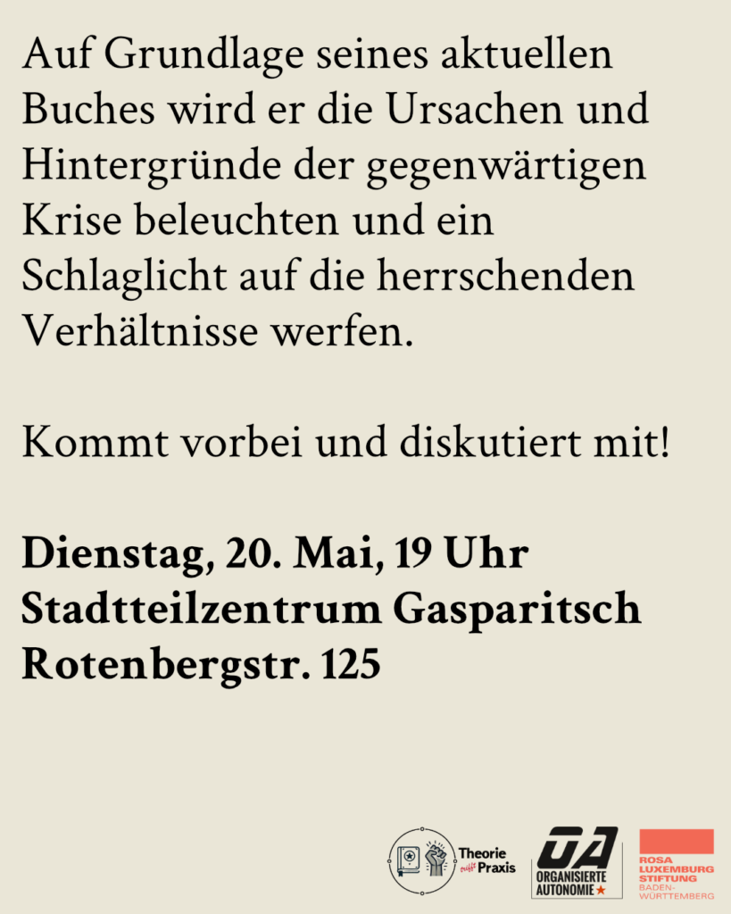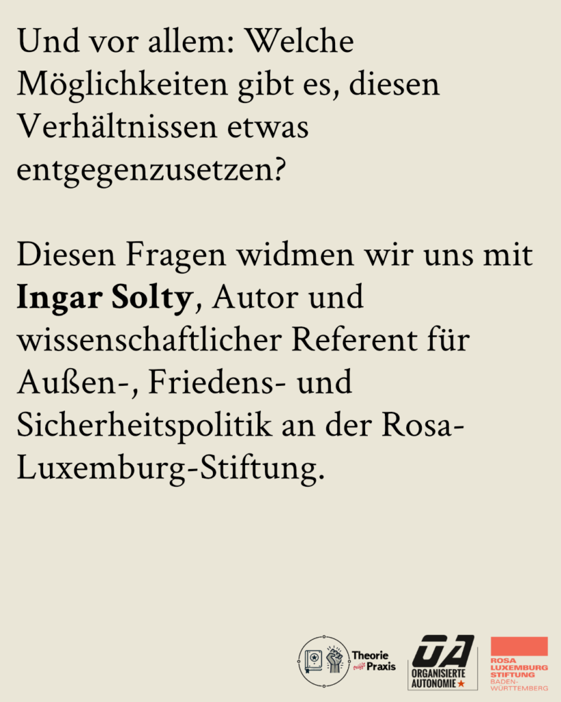 Diesen Fragen widmen wir uns mit Ingar Solty, Autor und wissenschaftlicher Referent für Außen-, Friedens- und Sicherheitspolitik an der Rosa-Luxemburg-Stiftung. Auf Grundlage seines aktuellen Buches wird er die Ursachen und Hintergründe der gegenwärtigen Krise beleuchten und ein Schlaglicht auf die herrschenden Verhältnisse werfen.