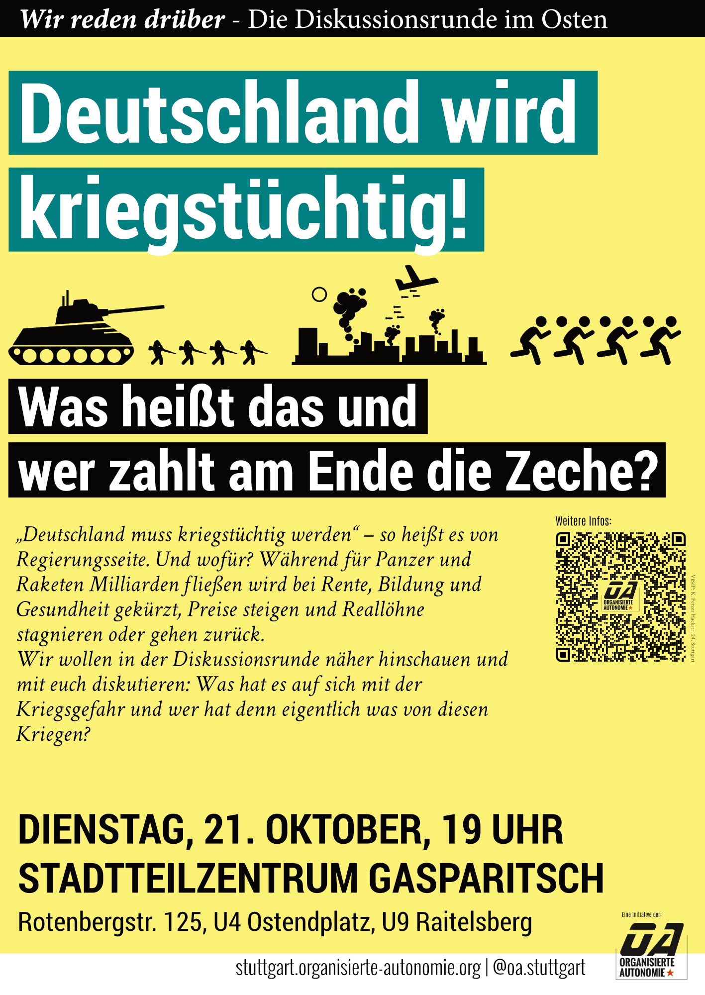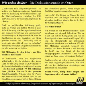Wir wollen in der Diskussionsrunde näher hinschauen und mit euch diskutieren: Was hat es auf sich mit der Kriegsgefahr und wer hat denn eigentlich was von diesen Kriegen? Was sind die Hintergründe der anlaufenden Kriegsmaschinerie und was bedeuten 175 oder 200 Milliarden eigentlich konkret? Wer profitiert von diesen Summen – und wer trägt die Last? Und wie hängt all das mit Kriegspropaganda zusammen – und warum zahlen am Ende immer wir statt der Reichen?